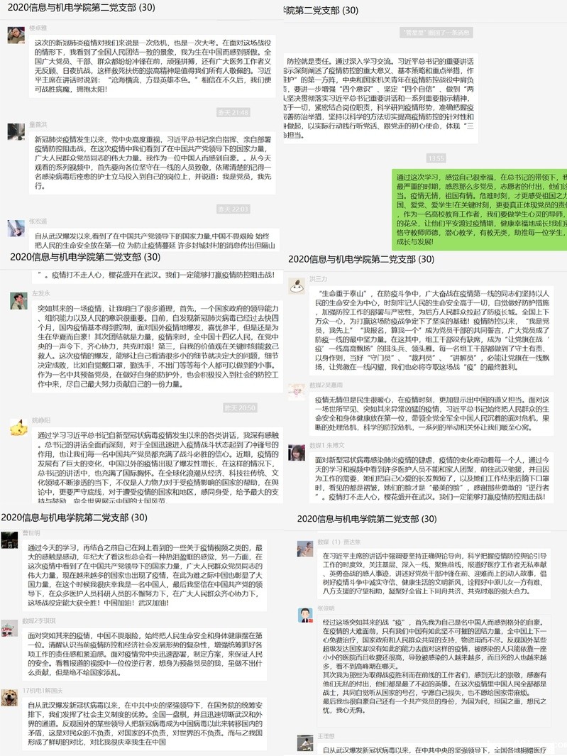 最后,党员们在线纷纷发表自己的感想,展开了热烈的讨论。大家纷纷表示,将牢记总书记教导,以奋斗者的姿态在大战大考中践行初心使命,在非常时期拿出担当作为。教师和学生党员纷纷表示疫情就是命令,防控就是责任!新冠肺炎疫情发生以来,校园里的“停课不停学”,实习企业的“复工复产”,党员更需真正做到“看好门、管好人、上好课”。打赢疫情防控阻击战是党中央向全党全国发出的动员令,作为高校教育工作者,作为新时代的大学生,我们一定会以更加坚强的党性,以更加有力的行动,全情投入校园防疫工作一线,以实际行动守初心、担使命。