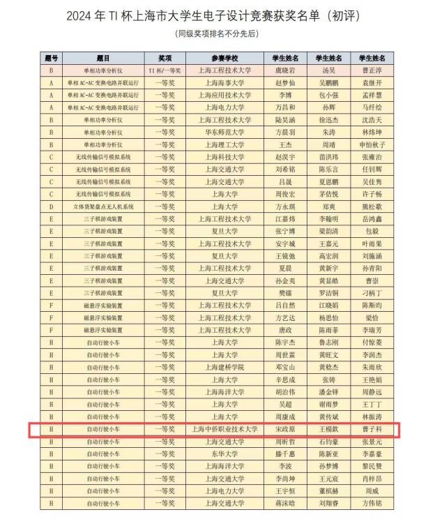7月29日上午,全国大学生电子设计竞赛上海赛区拉开帷幕,该竞赛为电子及电气相关等相关专业的本科生能够参加的高规格专业竞赛。在本届赛事中,我校智能制造学院和信息工程学院组建2支参赛队,经过队员们的不懈努力,在面对上海交通大学、复旦大学、同济大学、华东师范大学等高校竞争下,最终取得了上海市一等奖1项,二等奖1项的好成绩。